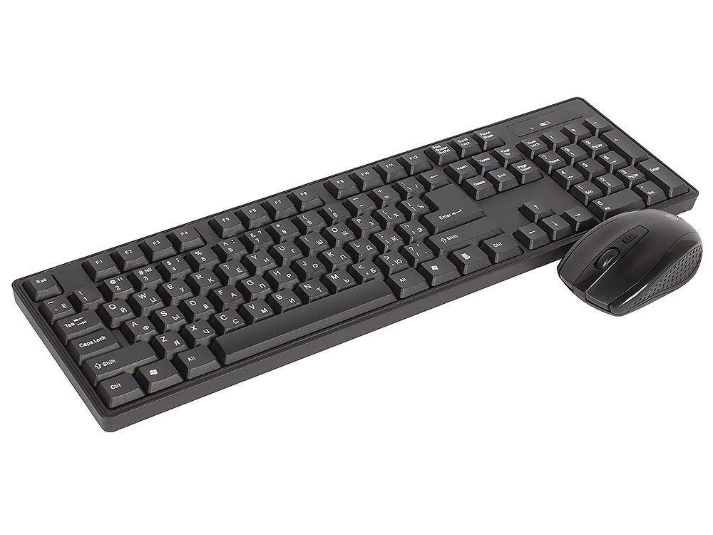 Тип комплекта: клавиатура + мышь (беспроводной) Подключение: USB-ресивер, радиоканал 2.4 ГГц Радиус действия: до ~10 м Клавиатура: мембранная, полноразмерная, 104 клавиши, цифровой блок Мышь: оптическая, симметричная, 3 кнопки + колесо-кнопка, разрешение сенсора 800 / 1000 / 1200 dpi Питание: клавиатура – 1×AA; мышь – 2×AAA (или наоборот в некоторых источниках) Цвет: чёрный Интерфейс подключения: USB Дополнительно: кнопка смены разрешения мыши, индикатор окончания заряда батареи на клавиатуре